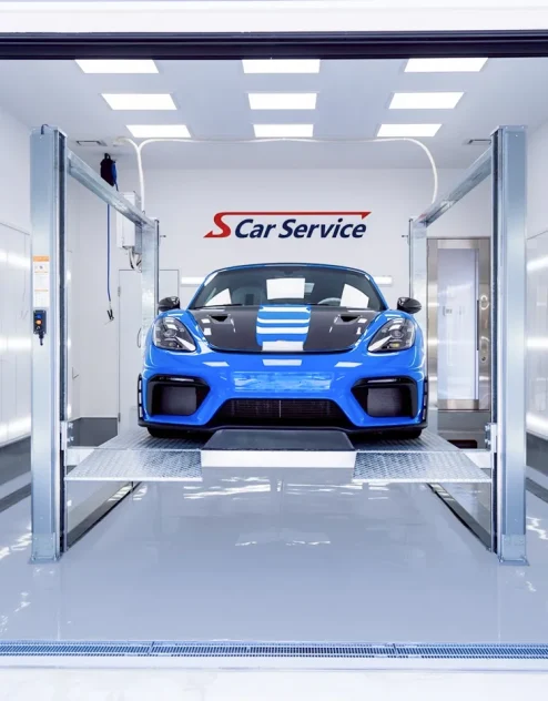 完成検査ブース プロテクションフィルムを施工した後に、完成検査ブースにクルマを移動して摂氏30度の環境を維持したまま3日間乾燥させます。プロテクションフィルム施工にとってはこの3日間がとても大切です。理由はフィルム施工後の不具合(フィルムの剥がれや浮き)は多くの場合この期間に発生するからです。