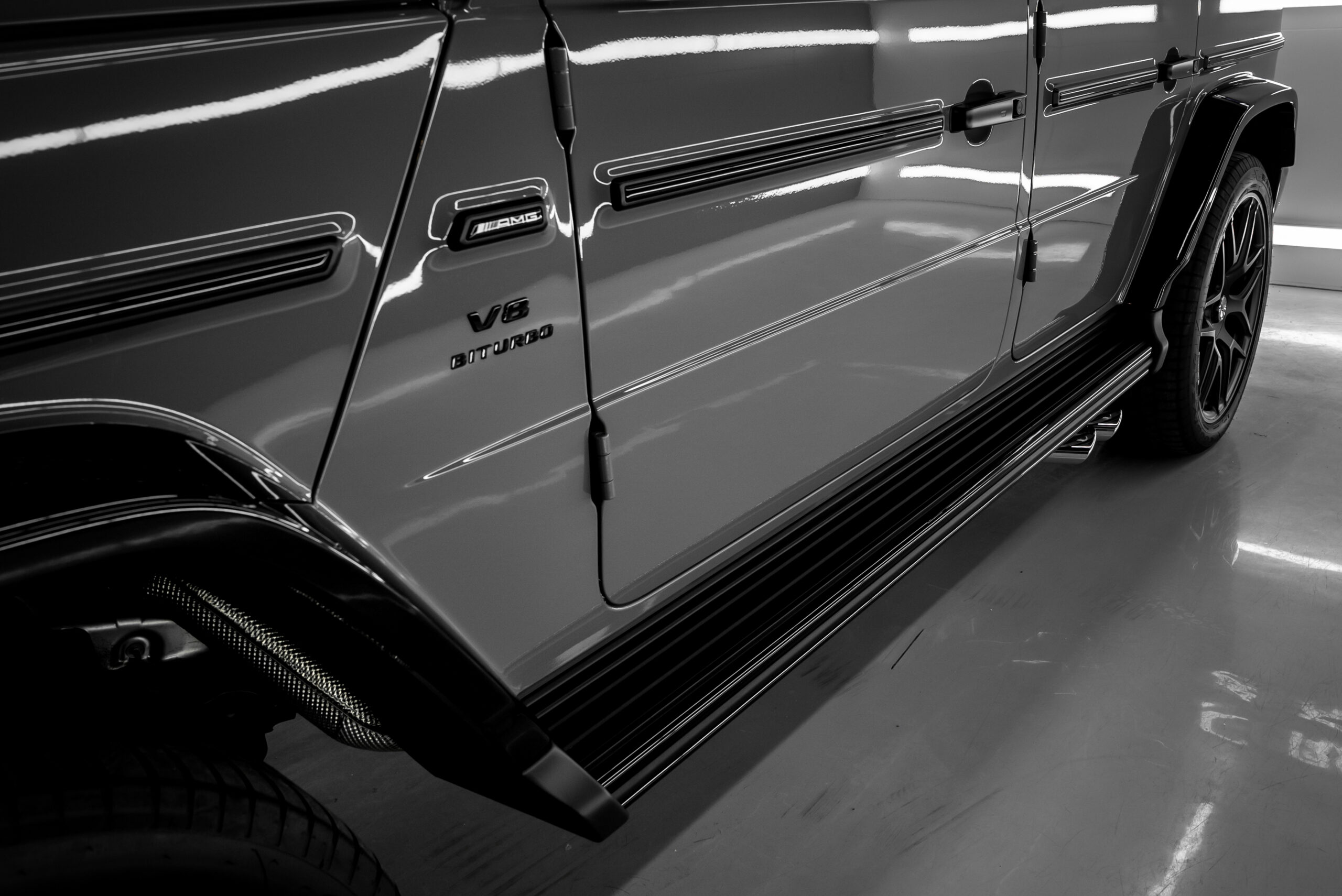 Gクラスは、地面から車体までの高さが高いため、サイドステップやランニングボードと呼ばれるステップが装備されています。